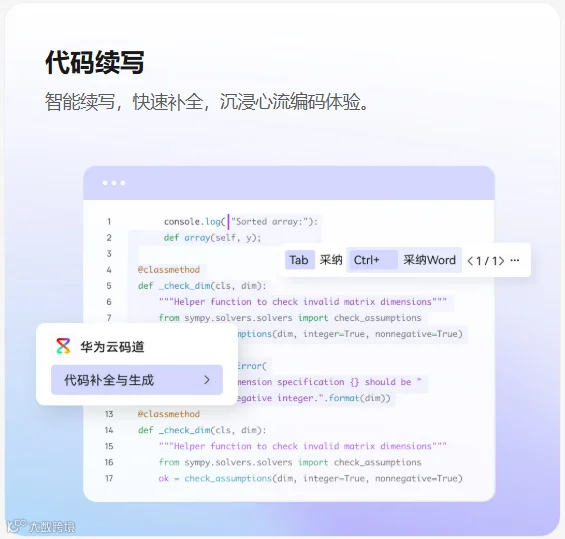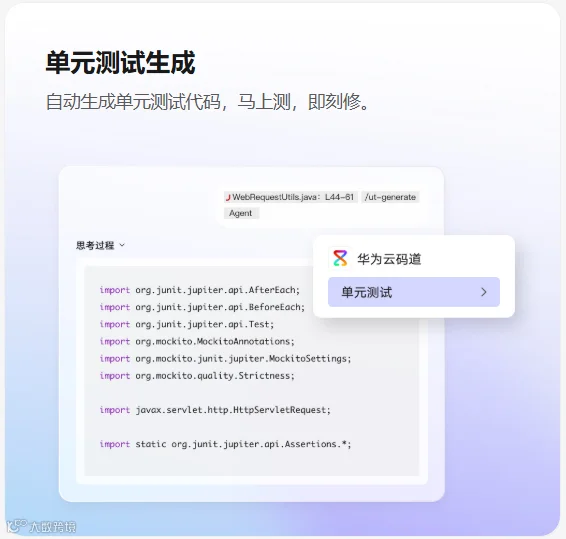 在质量保障方面,华为云码道将多年的研发工程经验总结提炼,形成可以被AI智 能体读取的明确、结构化、可验证的“规范”,聚焦研发全链路提质降本,强调 代码质量、合规性和工程可落地性。在基于华为研发工程的规范驱动开发模式下, 华为云码道还提供“代码生成符合规范、单元测试全面覆盖、端云协同智能检查、 问题修复自愈闭环”等多重智能防护,全流程加持代码质量。