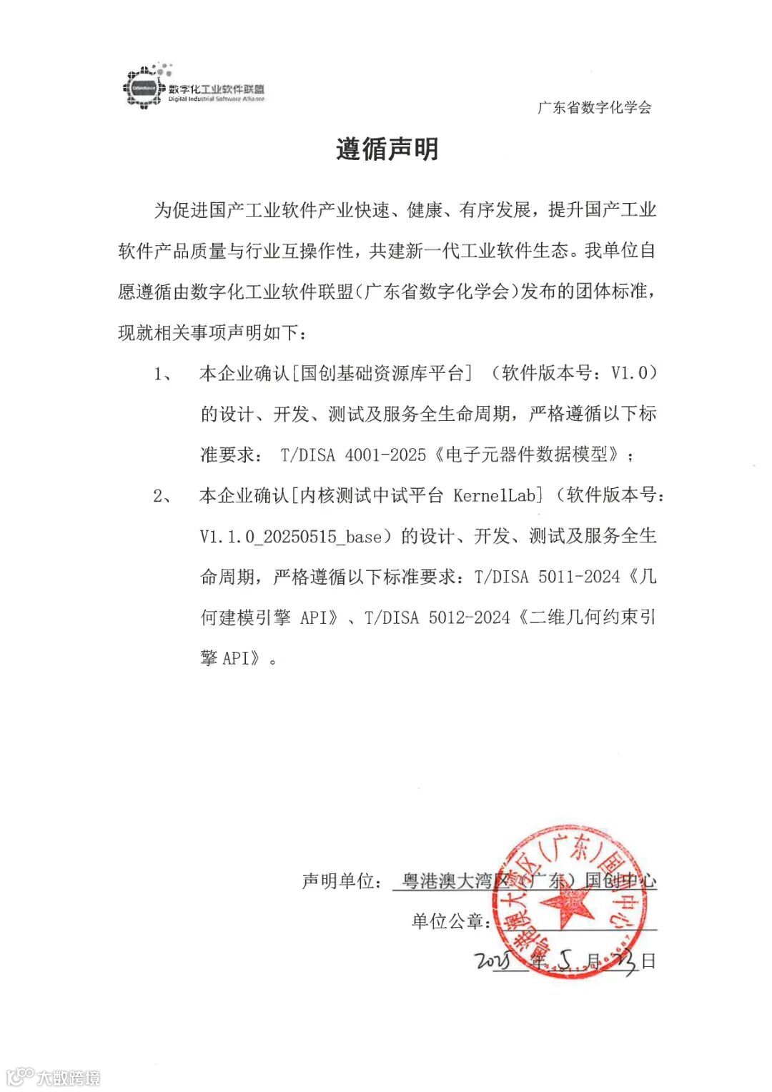 为促进国产工业软件产业快速、健康、有序发展,提升国产工业软件产品质量与行业互操作性,共建新一代工业软件生态,粤港澳大湾区(广东)国创中心自愿遵循由数字化工业软件联盟(广东省数字化学会)发布的《电子元器件数据模型》标准、《几何建模引擎API》标准、《二维几何约束引擎API》标准并发布公开声明。具体内容如下: