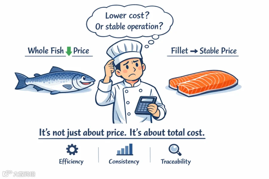 第一,是采购心理压力。整鱼更便宜时,鱼柳就会显得“贵”,客户自然会产生比较和犹豫。