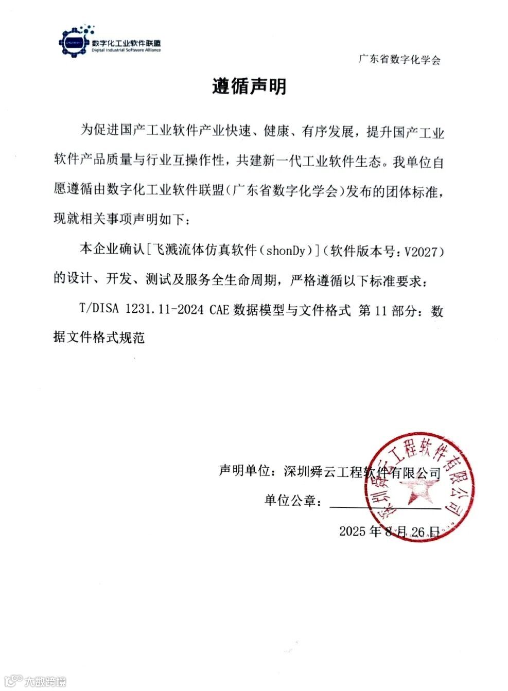 为促进国产工业软件产业快速、健康、有序发展,提升国产工业软件产品质量与行业互操作性,共建新一代工业软件生态,深圳舜云工程软件有限公司自愿遵循由数字化工业软件联盟(广东省数字化学会)发布的《CAE数据模型与文件格式》团体系列标准并发布公开声明。具体内容如下: