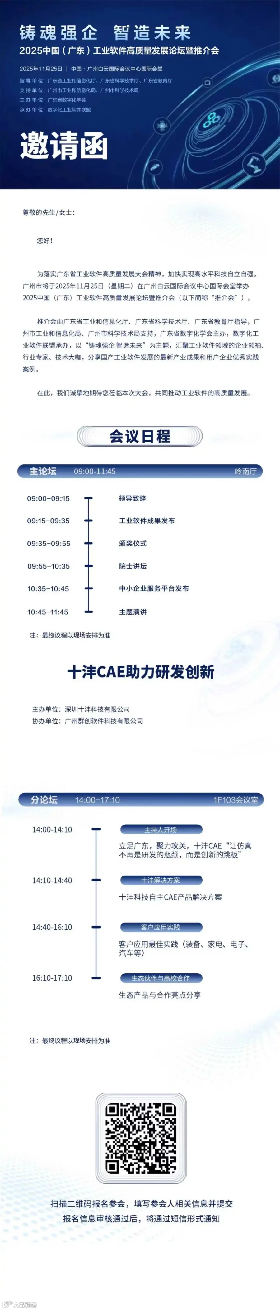 主题论坛邀请函及报名入口如下,欢迎扫码注册参会,请选择“分论坛4:十沣CAE助力研发创新”。