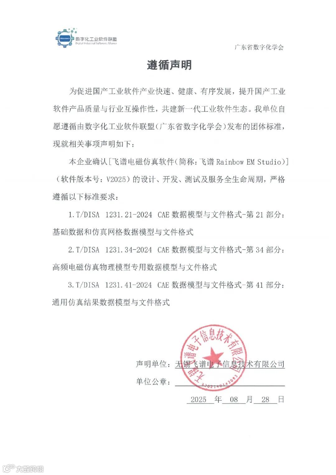 为促进国产工业软件产业快速、健康、有序发展,提升国产工业软件产品质量与行业互操作性,共建新一代工业软件生态,无锡飞谱电子信息技术有限公司自愿遵循由数字化工业软件联盟(广东省数字化学会)发布的《CAE数据模型与文件格式》团体系列标准并发布公开声明。具体内容如下:
