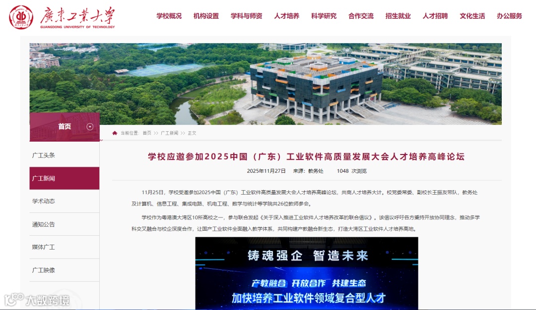 11月25日,2025中国(广东)工业软件高质量发展大会人才培养高峰论坛(以下简称“论坛”)于广州白云区召开。会上,中山大学、华南理工大学、广东工业大学、东莞理工学院和深圳信息职业技术大学等大湾区十所高校共同发布《关于深入推进工业软件人才培养改革的联合倡议书》(以下简称“倡议”)。同时评选出工业软件人才培养十佳合作企业。