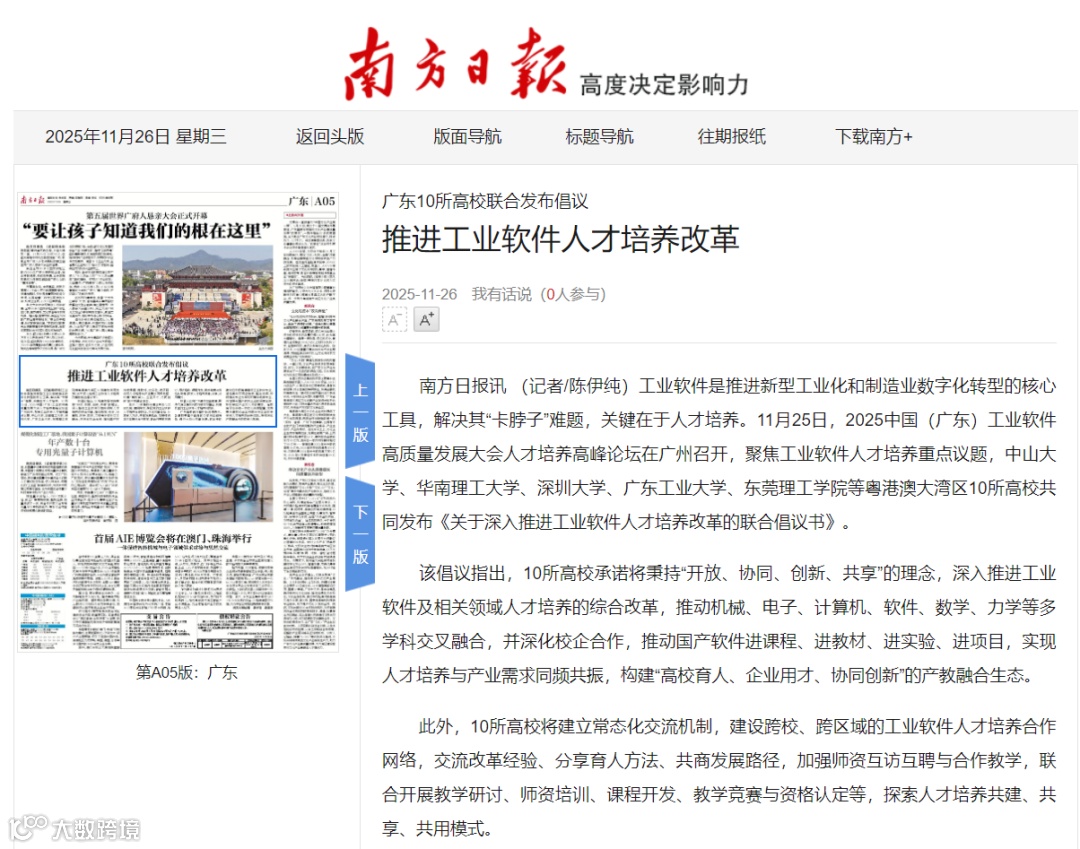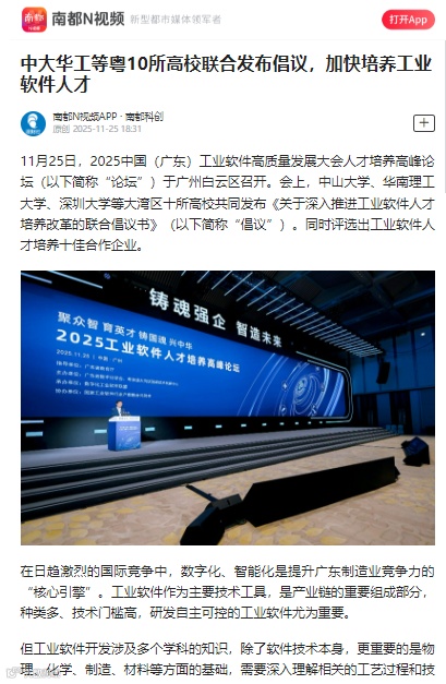 除南方日报外,广州日报新花城、南都科创、走进广东造、广东教育头条、深圳新闻网等多家媒体持续报道,深度分析工业软件人才培养背后释放出的信号,是广东省为实现高水平科技自立自强的探索,也是业界对拥有多学科知识、自主创新能力且适配产业需求的工业软件人才的紧迫需求的回应。