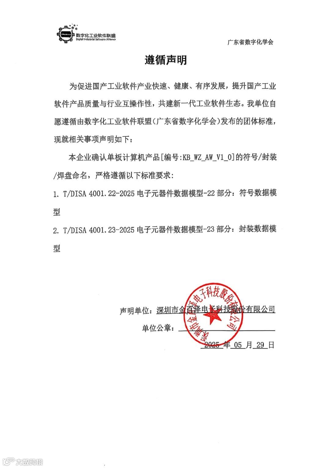 为促进国产工业软件产业快速、健康、有序发展,提升国产工业软件产品质量与行业互操作性,共建新一代工业软件生态,深圳金百泽电子科技有限公司自愿遵循由数字化工业软件联盟(广东省数字化学会)发布的《电子元器件数据模型》标准并发布公开声明。具体内容如下: