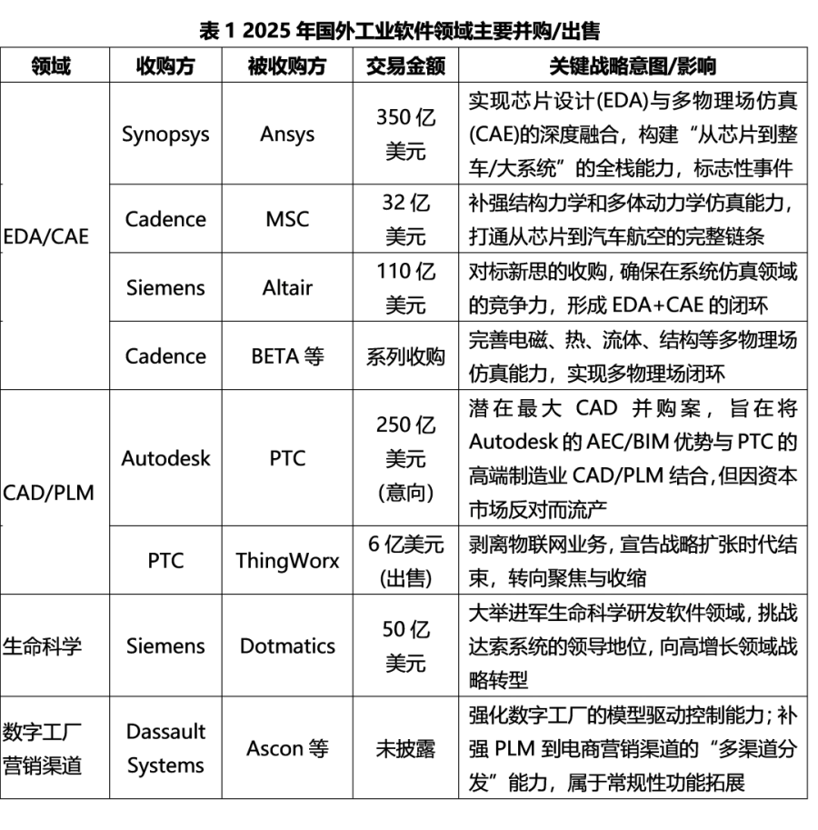 2025年,全球工业软件领域迎来史上最密集的超级并购潮,全年至少发生十起50亿美元级别的并购案,其中新思科技以350亿美元收购 Ansys,创下工业软件历史上最高交易额的并购纪录。
