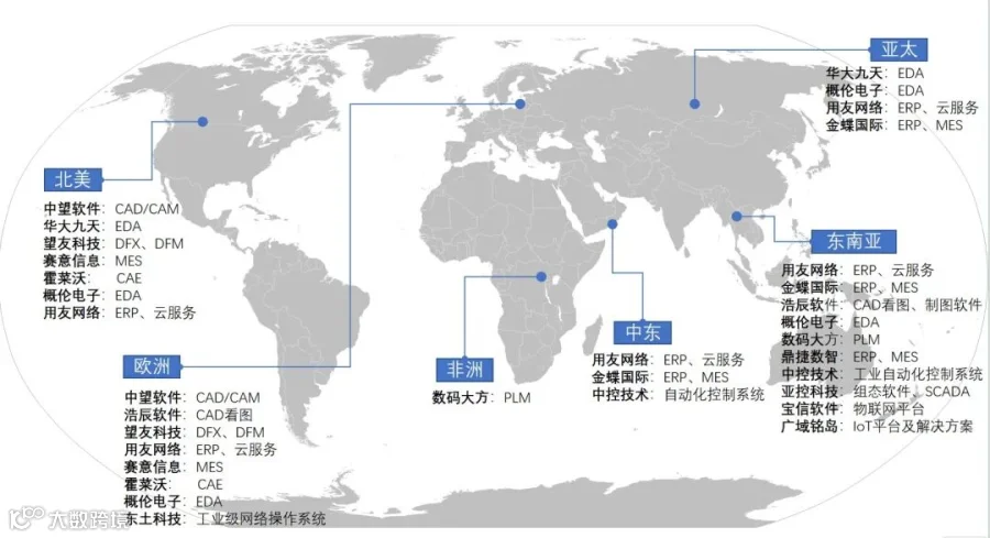 2025年,中国工业软件本土市场增长放缓,而出海热潮持续升温,成为行业发展的新亮点。2025年4月,浩辰软件收购匈牙利建筑信息模型(BIM)软件开发公司CadLine,不仅获得其自主BIM技术,更承接了其在中东欧、独联体地区的1000余家企业客户资源。索辰科技在收购欧洲电磁仿真巨头WIPL-D核心技术资产后,于5月在匈牙利成立海外全资子公司“Innovatech INT”。9月,金蝶中东区域总部正式落户卡塔尔,进一步完善其国际市场版图。中望软件计划参展2026年汉诺威工博会,将系统呈现其系列产品在欧洲及巴西市场的广泛应用案例,展现中国工业软件融入全球产业链的实际成果。海外市场中,除美欧地区外,东南亚、中东、“一带一路”沿线等新兴市场也极为旺盛,国产工业软件有效填补了当地数字化转型的“真空地带”(如图6所示[3])。