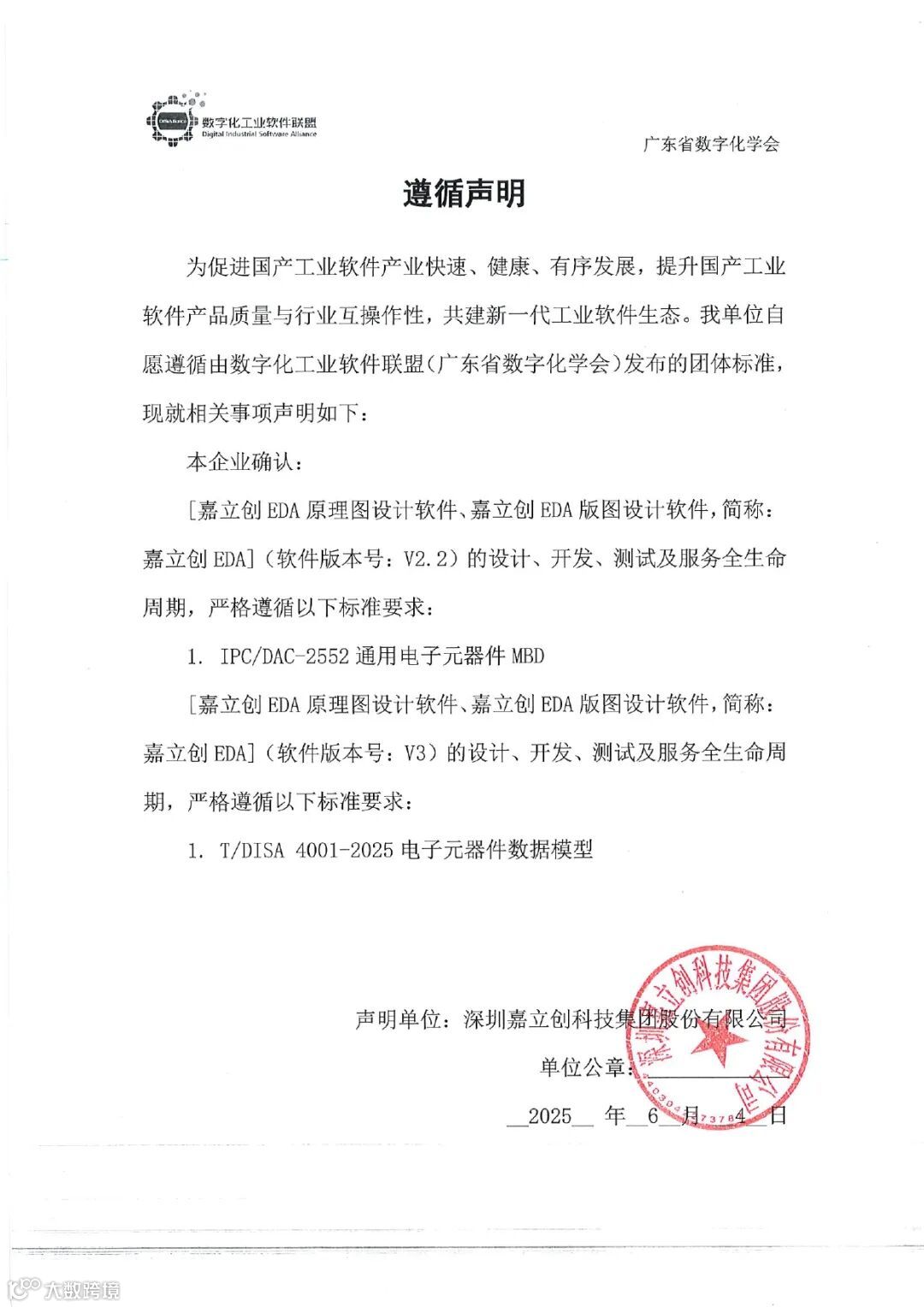 为促进国产工业软件产业快速、健康、有序发展,提升国产工业软件产品质量与行业互操作性,共建新一代工业软件生态,深圳嘉立创科技集团股份有限公司自愿遵循由数字化工业软件联盟(广东省数字化学会)发布的《通用电子元器件MBD》国际标准、《电子元器件数据模型》团体标准并发布公开声明。具体内容如下: