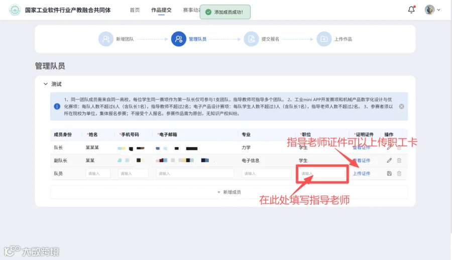 指导老师信息在添加团队成员时同步添加,职位写指导老师。证明证件可以使用职工卡。学生可以提交学生证、学生卡、学信网等证明学生身份的材料,需要有照片及学校信息。原则上不使用身份证作为参赛证明材料。