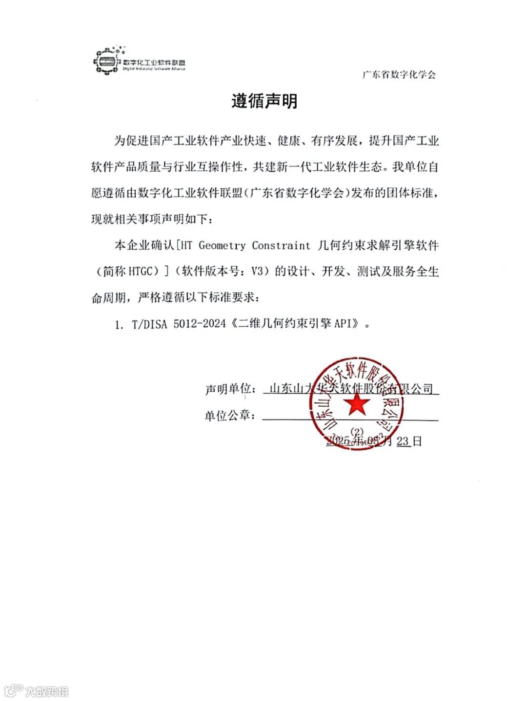 为促进国产工业软件产业快速、健康、有序发展,提升国产工业软件产品质量与行业互操作性,共建新一代工业软件生态,山东山大华天软件股份有限公司自愿遵循由数字化工业软件联盟(广东省数字化学会)发布的《二维几何约束引擎API》标准并发布公开声明。具体内容如下: