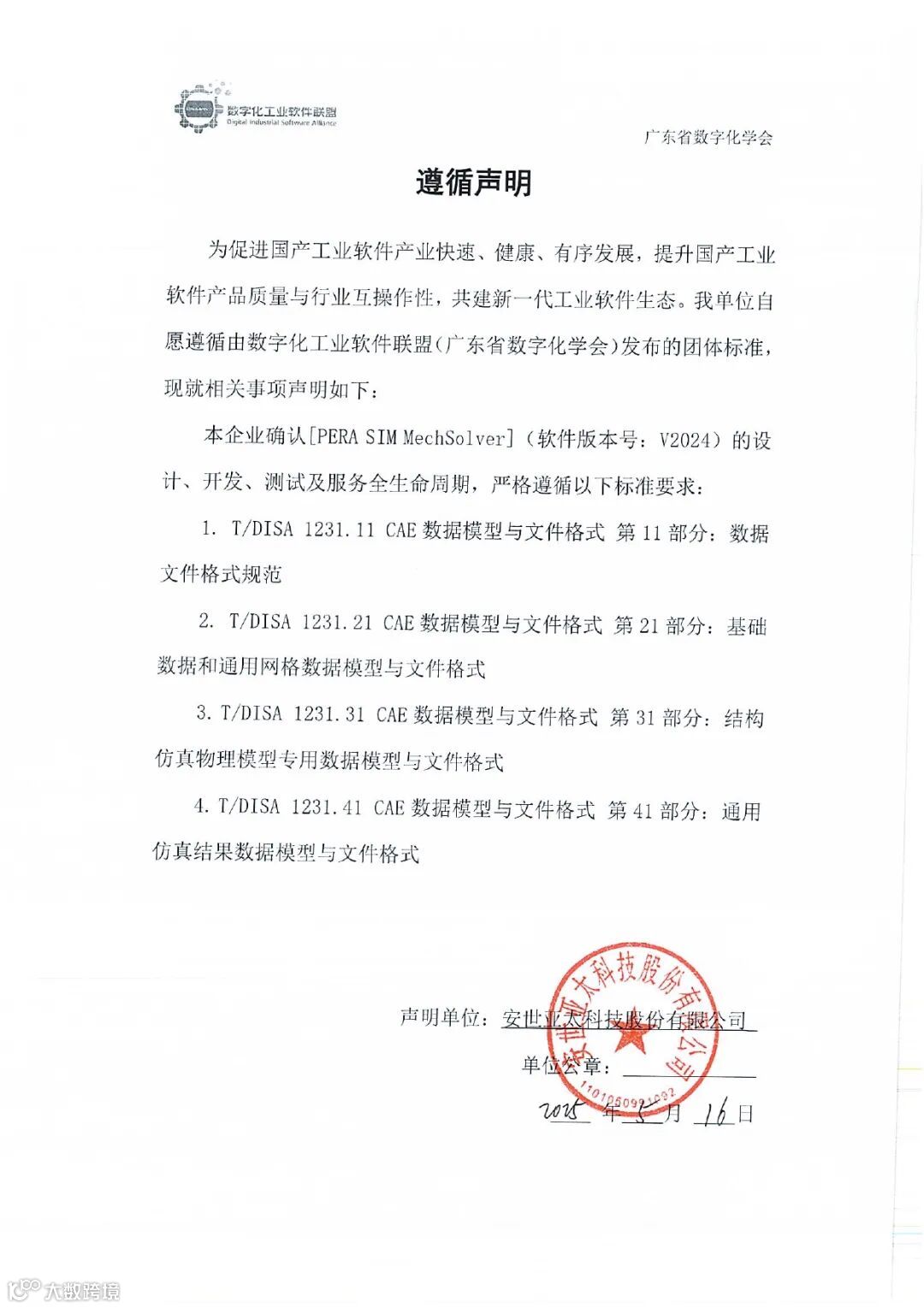 为促进国产工业软件产业快速、健康、有序发展,提升国产工业软件产品质量与行业互操作性,共建新一代工业软件生态,安世亚太股份有限公司自愿遵循由数字化工业软件联盟(广东省数字化学会)发布的《CAE数据模型与文件格式》团体系列标准并发布公开声明。具体内容如下: