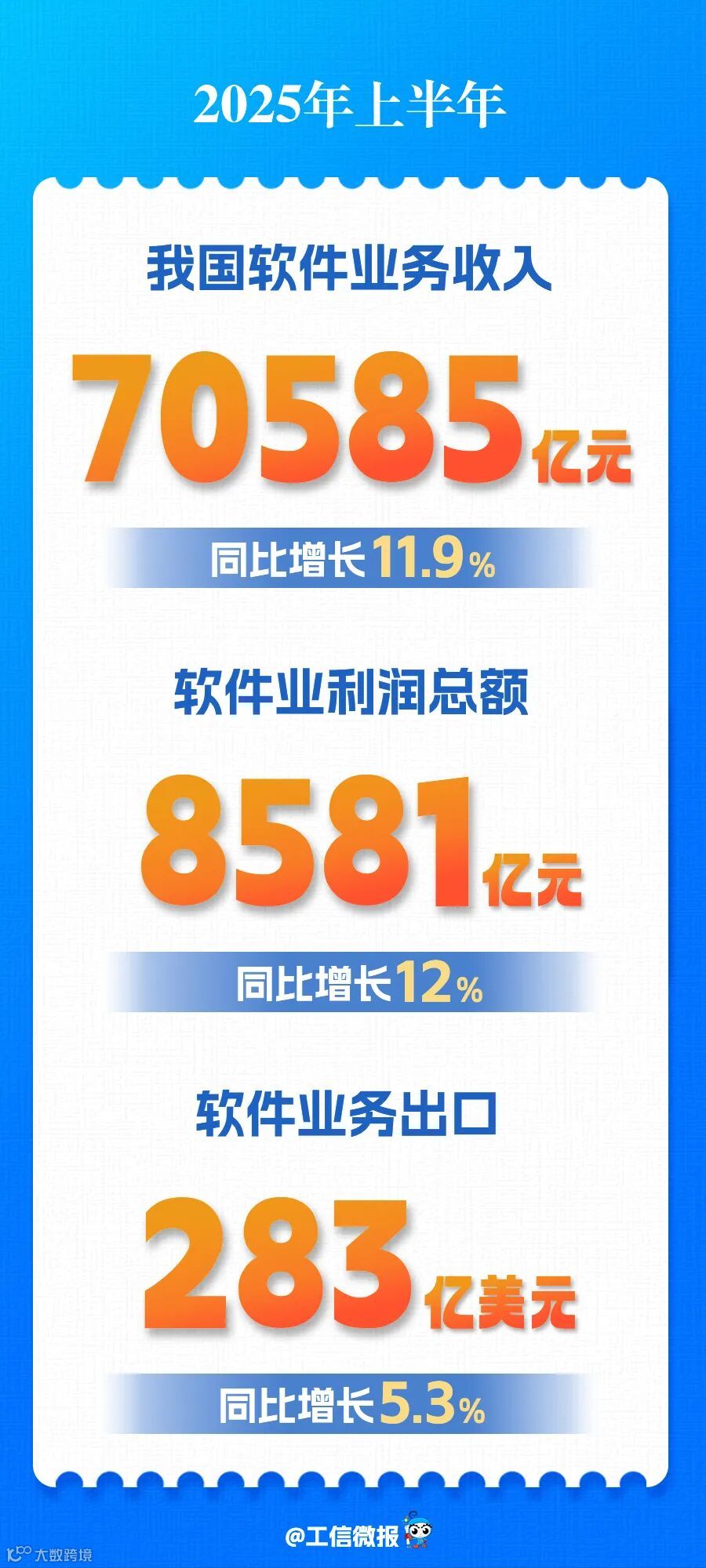 2025年上半年,我国软件和信息技术服务业(以下简称“软件业”)运行态势良好,软件业务收入稳健增长,利润总额保持两位数增长,软件业务出口保持正增长。