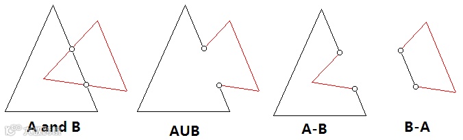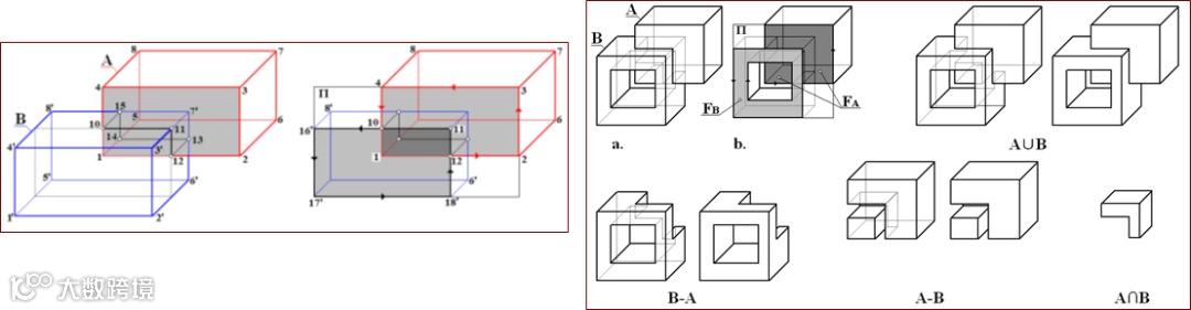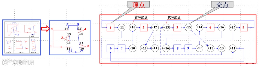 基于交点几何数的布尔运算算法:从某一个交点出发搜索,对并(交、差)运算,若交点几何数为负(正),则转向另一环,直至回到该搜索出发时的首交点,就得到一个新边界(环)。一旦所有交点均被遍历,算法结束。