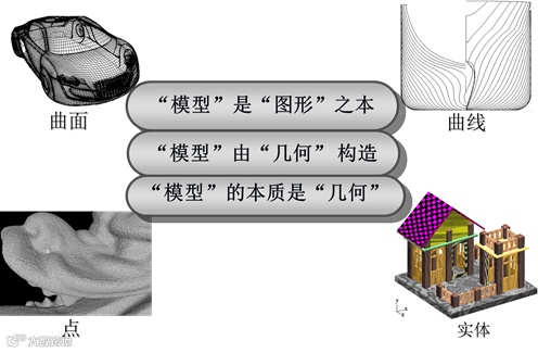 模型由几何描述,由点/线/圆/面等构成基本几何,由曲线曲面建立高级几何。