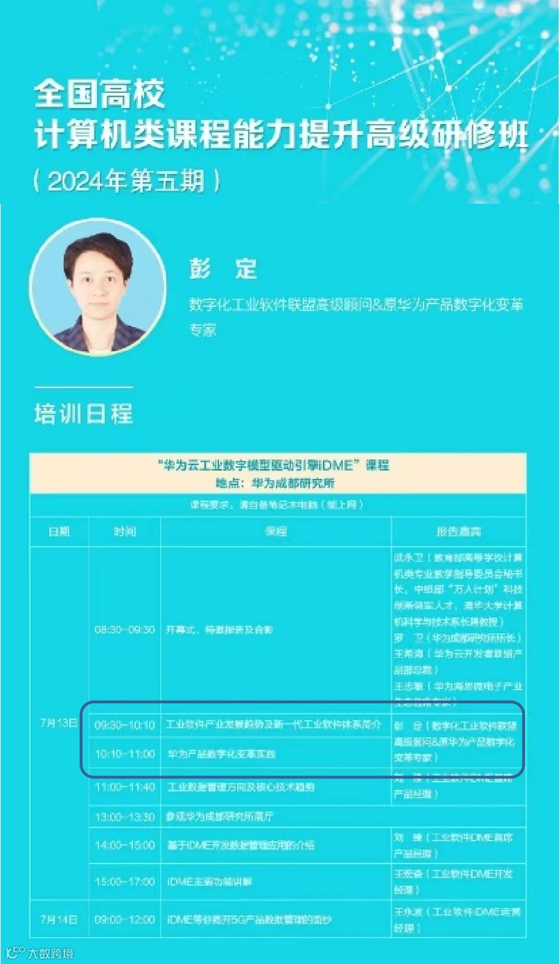 响应产教融合、服务国家战略需求,参与工业软件人才培养,打造数字化转型、IPD、产品数据管理培训等系列数字化&产品数据课程,进行云计算与大数据开发实训、华为云工业数字模型驱动引擎IDME、BoPrj演示等内容授课。以实战为导向,助力学员掌握前沿技术,服务国家产业升级与创新发展。