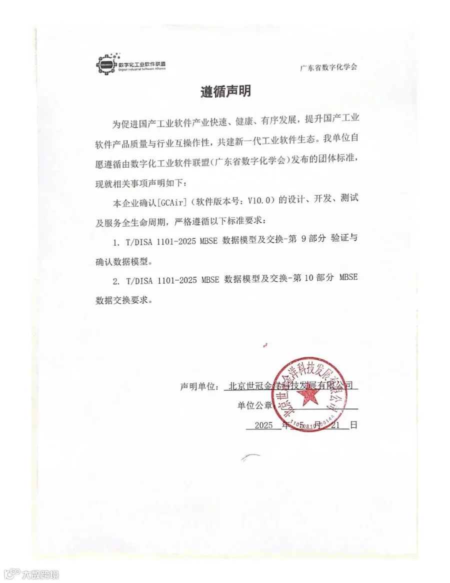 为促进国产工业软件产业快速、健康、有序发展,提升国产工业软件产品质量与行业互操作性,共建新一代工业软件生态,北京世冠金洋科技发展有限公司自愿遵循由数字化工业软件联盟(广东省数字化学会)发布的《MBSE数据模型及交换》标准并发布公开声明。具体内容如下: