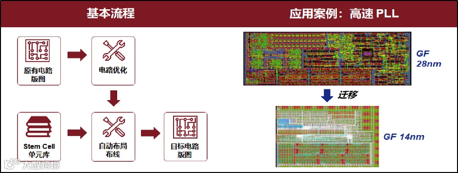 根据以上整体创新思路,经过“AI+”的产品核心功能包含新型模拟单元(Acell)版图生成、数模混合信号(AMS)自动化版图技术、AMS IP工艺迁移技术等。