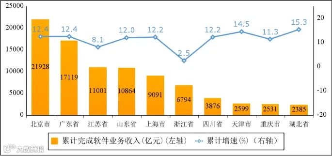 主要软件大省收入占比保持稳定。前三季度,北京、广东、江苏、山东、上海软件业务收入居全国前5,分别同比增长12.4%、12.4%、8.1%、12%和12.2%,5省(市)合计软件业务收入70004亿元,占全国比重为71.2%,占比较上半年回落0.4个百分点。