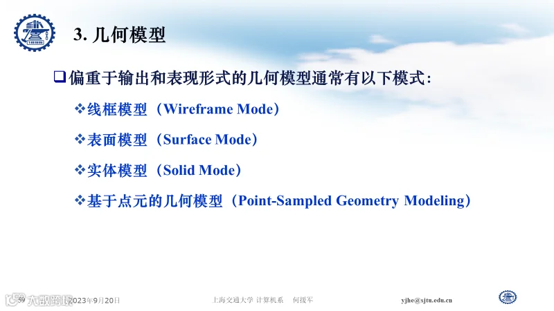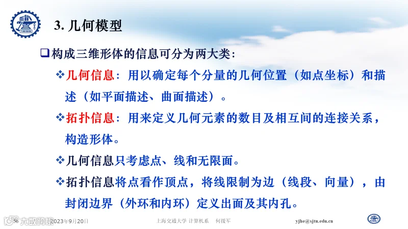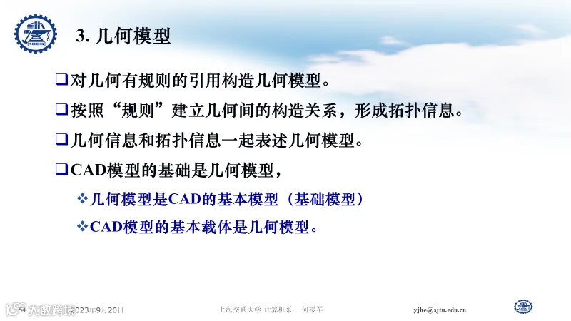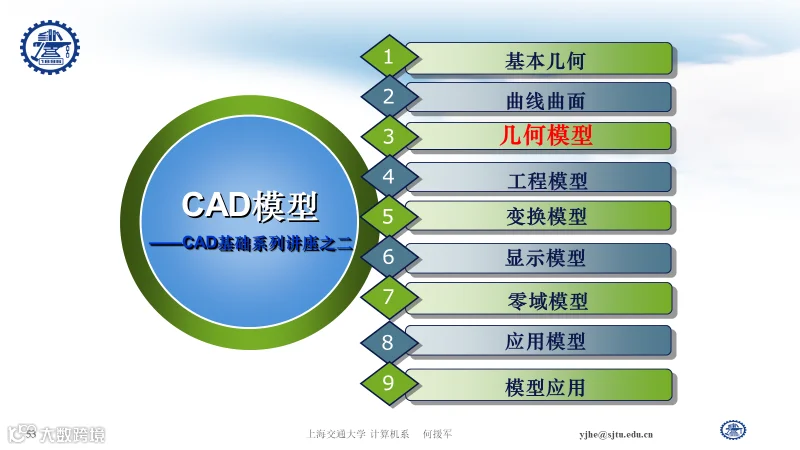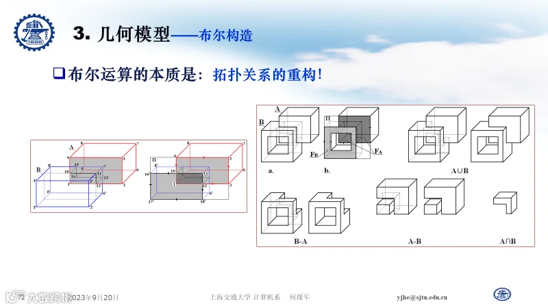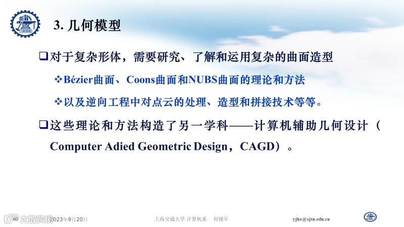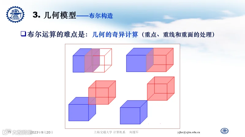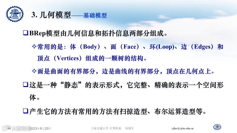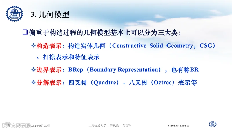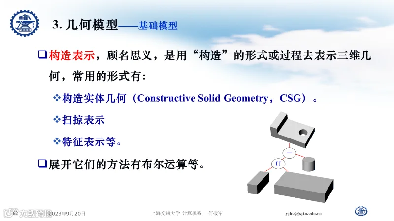 围绕几何模型的构造、操作、运算、变换、显示和传输、转换等展开。