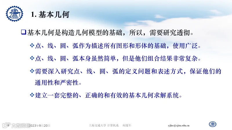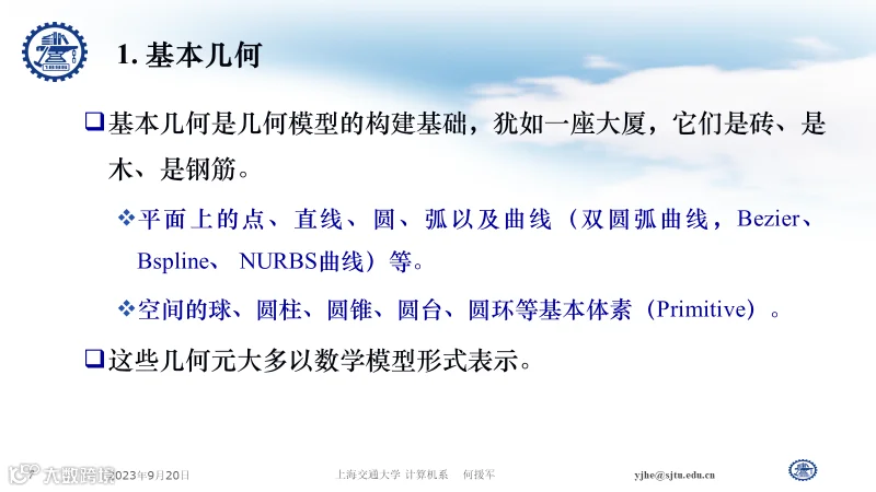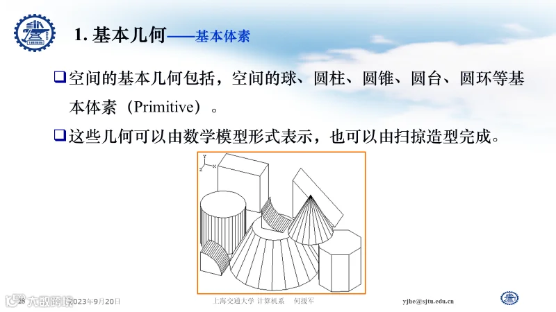 “形体”和“形状”由几何描述,由点/线/圆/面等构成基本几何,由曲线曲面建立高级几何。