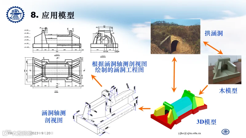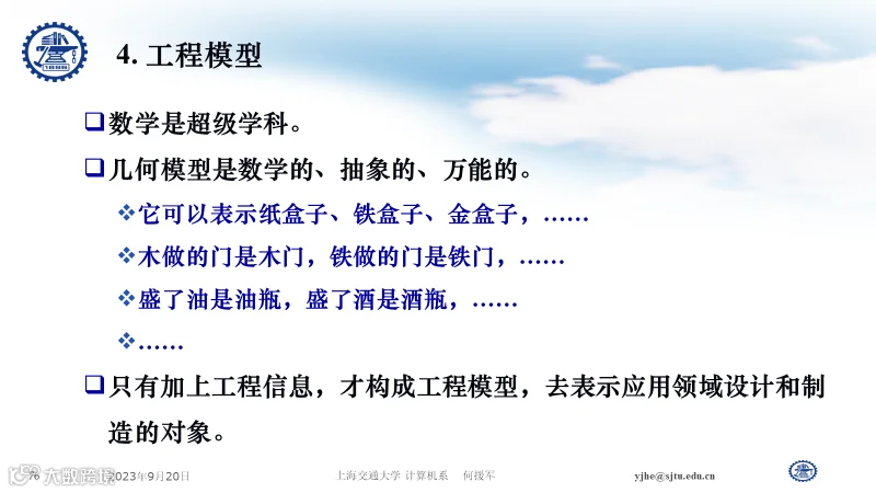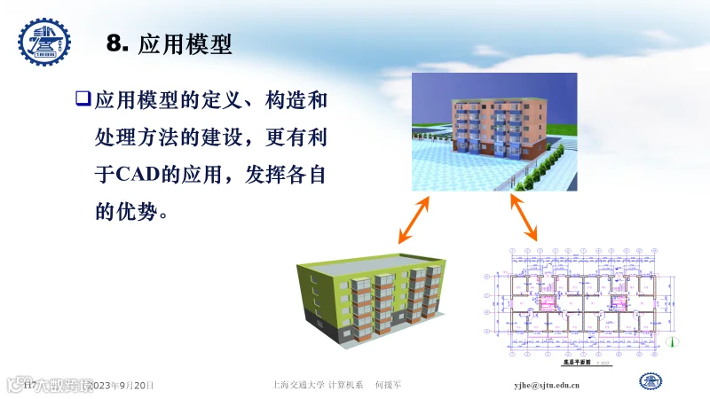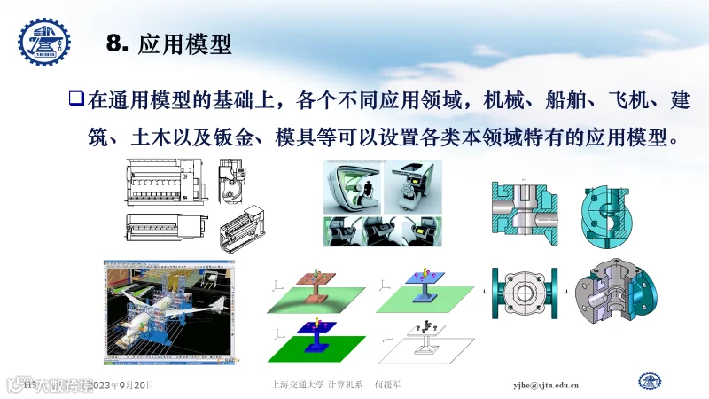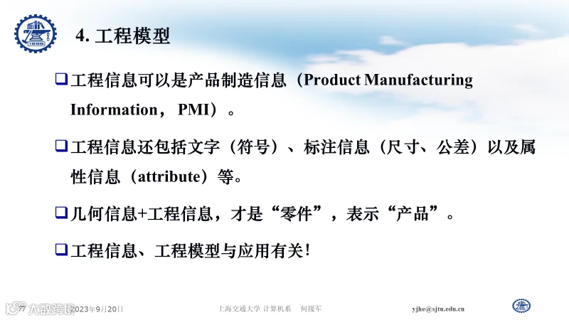 在几何模型上,附加承载工程内容与工程属性信息形成工程模型,赋予工程含义,形成工程零件,构造各种应用模型,用于各领域的模型应用。