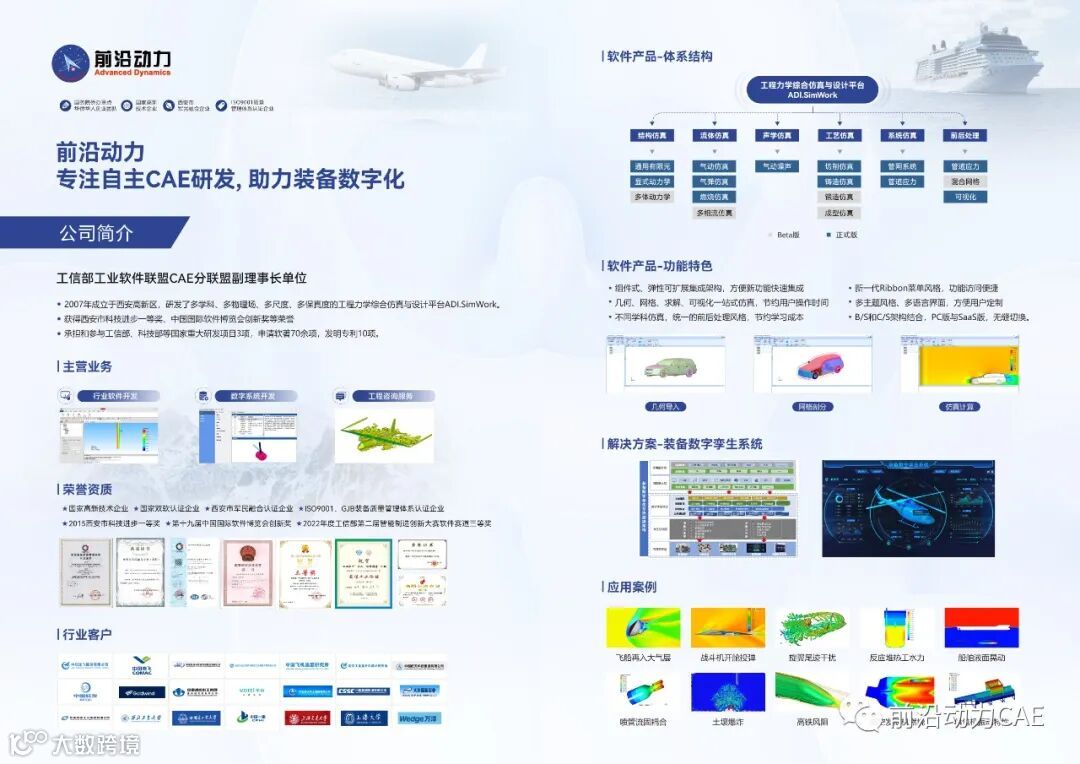 前沿动力公司(ADI)是由海外归国科研团队与国内院校、研究所、部队和航空航天、兵器兵装等单位行业科研骨干联合创立的国家认定军民融合企业,专注于飞行器等高端装备及其软件仿真与评估(CAE)领域自主研发的高科技企业。公司主要产品包括:计算流体力学、计算结构力学、流固热声等多场耦合、高超声速传热与发动机燃烧、冲击爆炸等计算机仿真与评估系列软件。目前独立开发CAE软件16款,获自主软件著作权71项、专利10项。