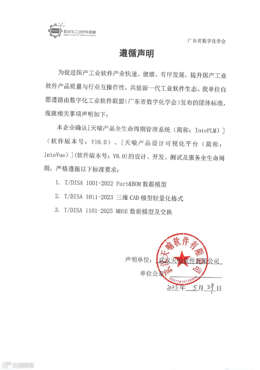 为促进国产工业软件产业快速、健康、有序发展,提升国产工业软件产品质量与行业互操作性,共建新一代工业软件生态,武汉天喻软件有限公司自愿遵循由数字化工业软件联盟(广东省数字化学会)发布的《Part&BOM数据模型》标准、《三维CAD轻量模型化格式》标准、《MBSE数据模型及交换》标准,并发布公开声明。具体内容如下: