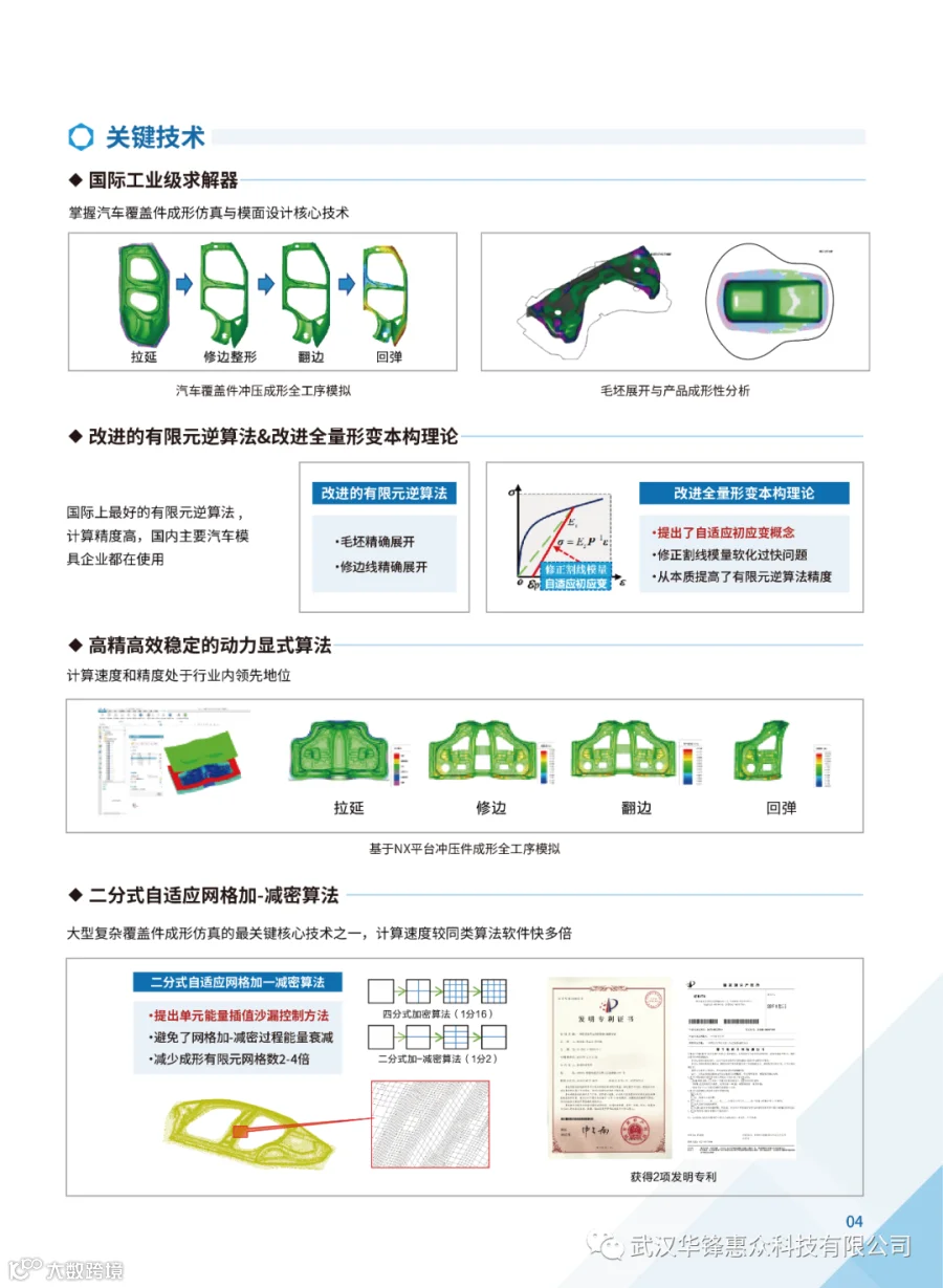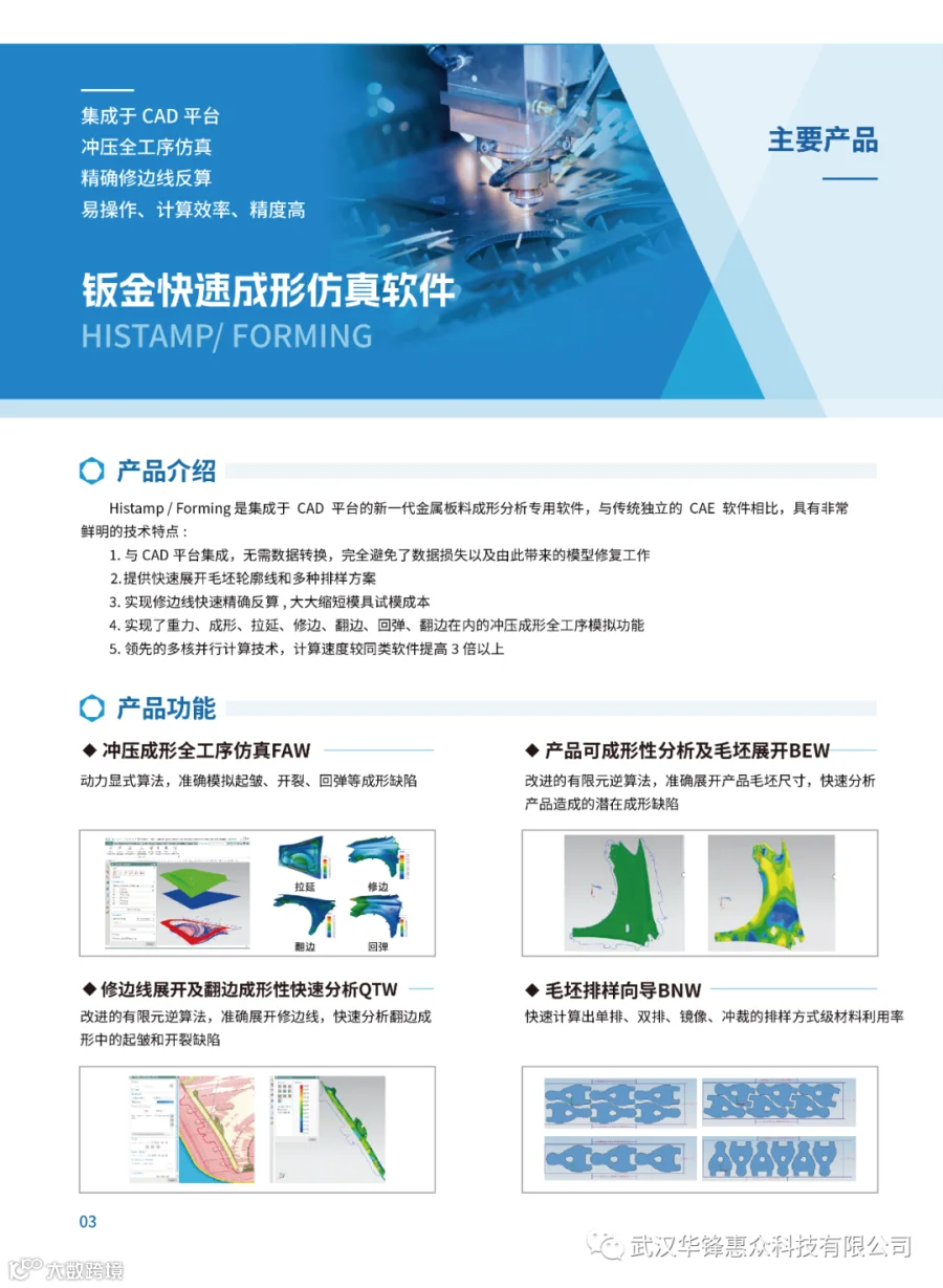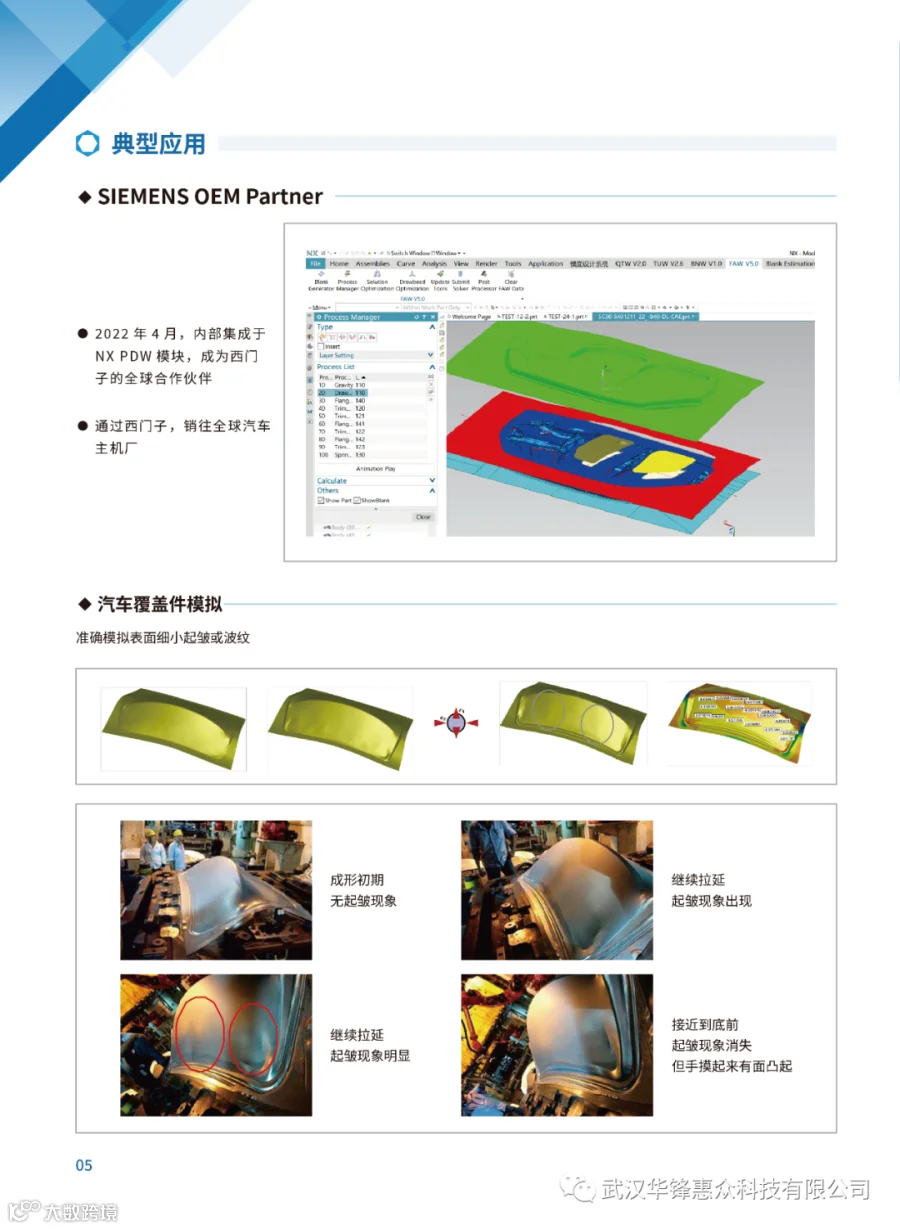 武汉华锋惠众科技有限公司是汽车与模具行业专业的智能制造工业软件服务商,可为汽车、家电等冲压模具行业提供专业的行业软件解决方案和工业软件定制化开发服务。公司拥有国内唯一自主可控的商用饭金快速成形仿真软件,是西门子工业软件 NX Forming模块的 OEM,也是目前国内同行业中极具竞争力的高新技术企业。
