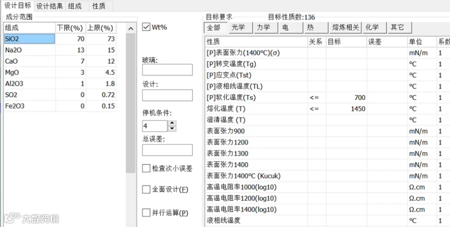 2、配方优化设计:根据对玻璃性能以及工艺参数的要求,自动优化设计玻璃配方。