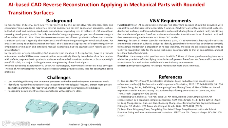 工业软件是先进工业知识与经验的凝炼,工业软件自身的先进性既来自对先进工业先进需求的汲取提炼,也来自对根技术新突破、新成果的高效采用。为增强根技术新成果提供方与工业软件厂家或最终用户方的连接,促进国产工业软件差异化竞争力的打造,数字化工业软件联盟将围绕计算几何、AI for CAX & AI Native、Cloud for CAX & Cloud Native等技术领域,发布工业软件新场景新技术难题,广泛征集解题思路方案,并展开后续的创新项目申报。