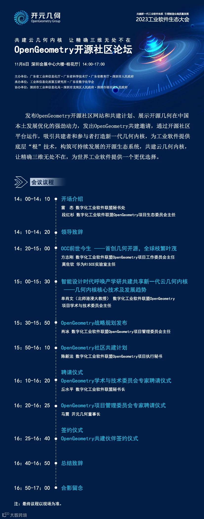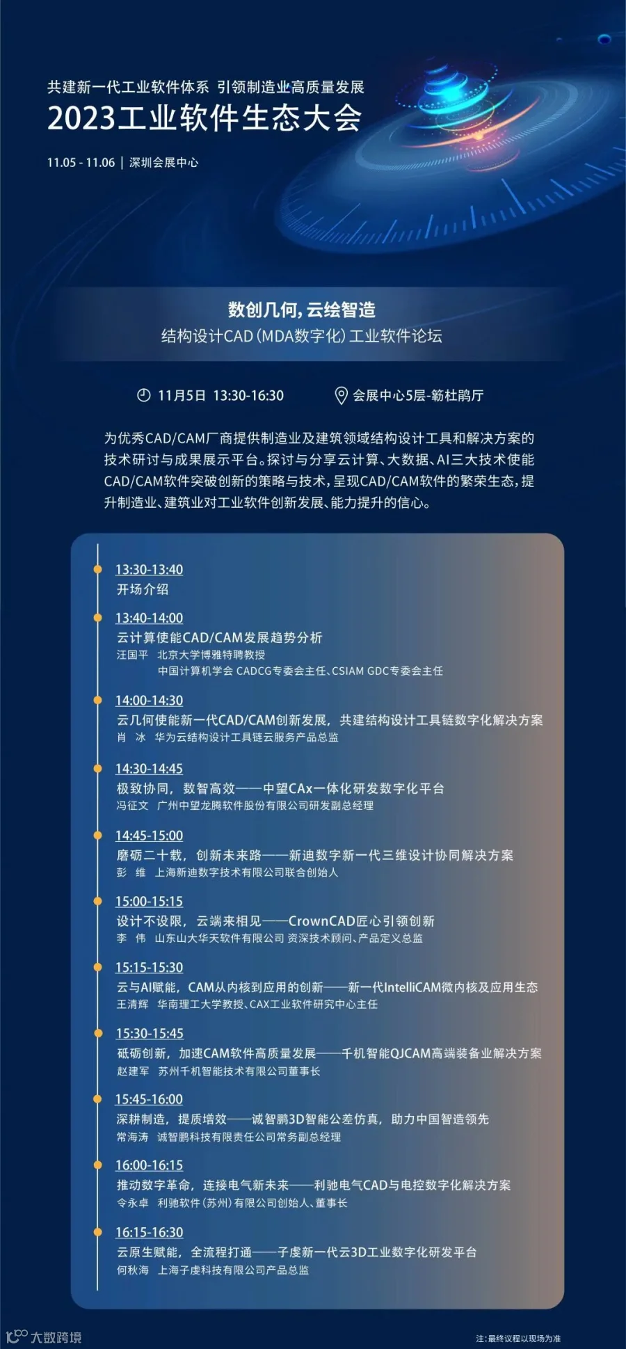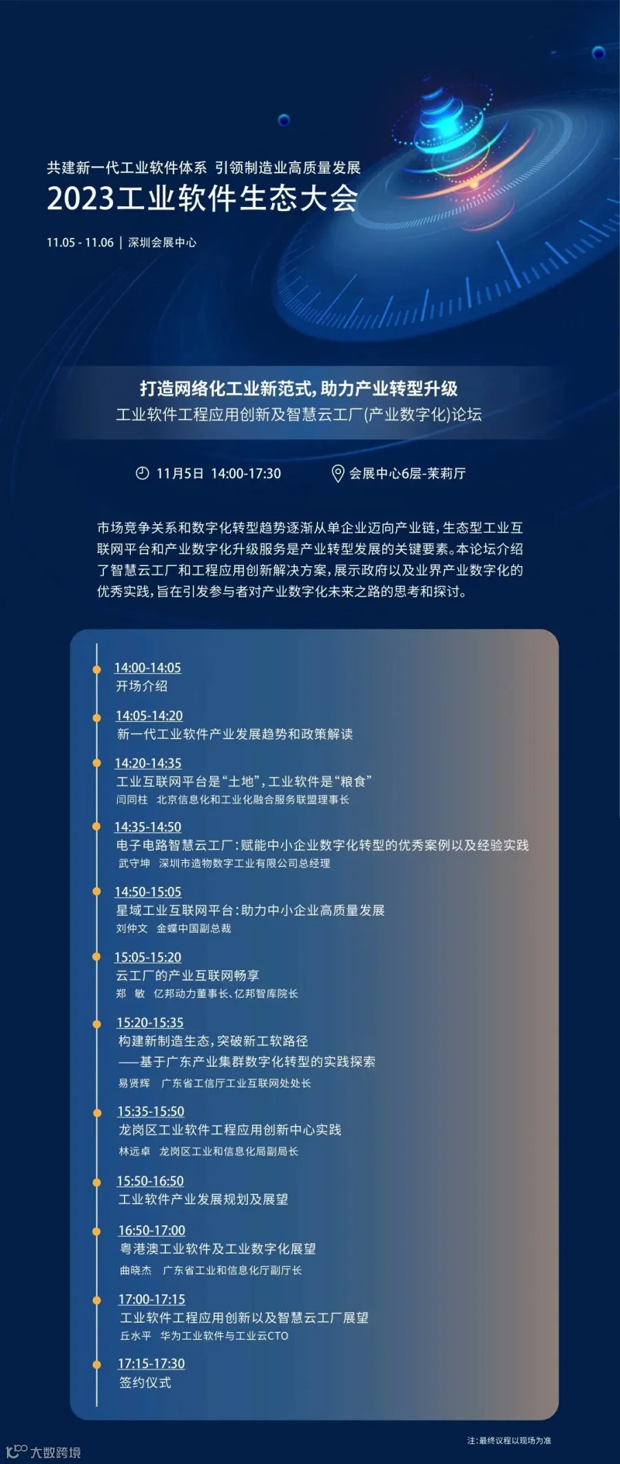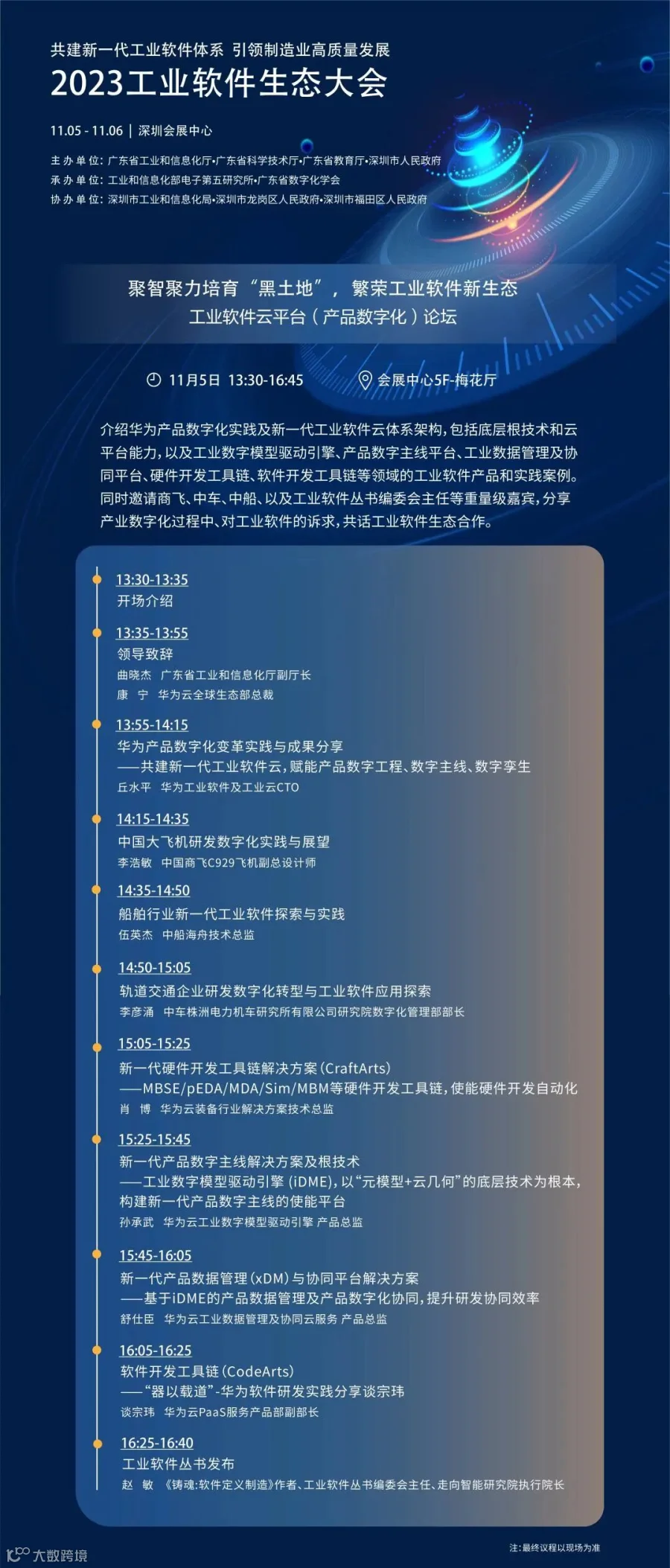 为深入实施国家软件发展战略,促进数字技术与实体经济深度融合,集中展示工业软件最新技术发展与应用实践成果,推动工业软件产业供需精准对接,构建开放、协作、共享的新一代工业软件生态体系,广东省工业和信息化厅、广东省科学技术厅、广东省教育厅、深圳市人民政府定于2023年11月5日至6日在深圳市举办2023工业软件生态大会。