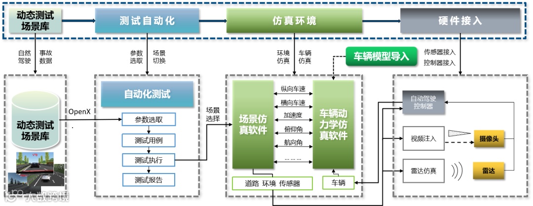 系统主要由通用的HIL实时仿真平台、传感器模拟设备、工作站等台架辅助设备、场景仿真软件、车辆动力学仿真软件、测试管理软件、自动化测试软件、测试场景库、驾驶模拟器(选配扩展)等组成。可帮助用户验证智能驾驶系统设计,提前发现问题,提高测试效率,实现对边缘/危险场景的测试,促进智能驾驶产品快速迭代,有效保障测试过程的人员及设备安全。
