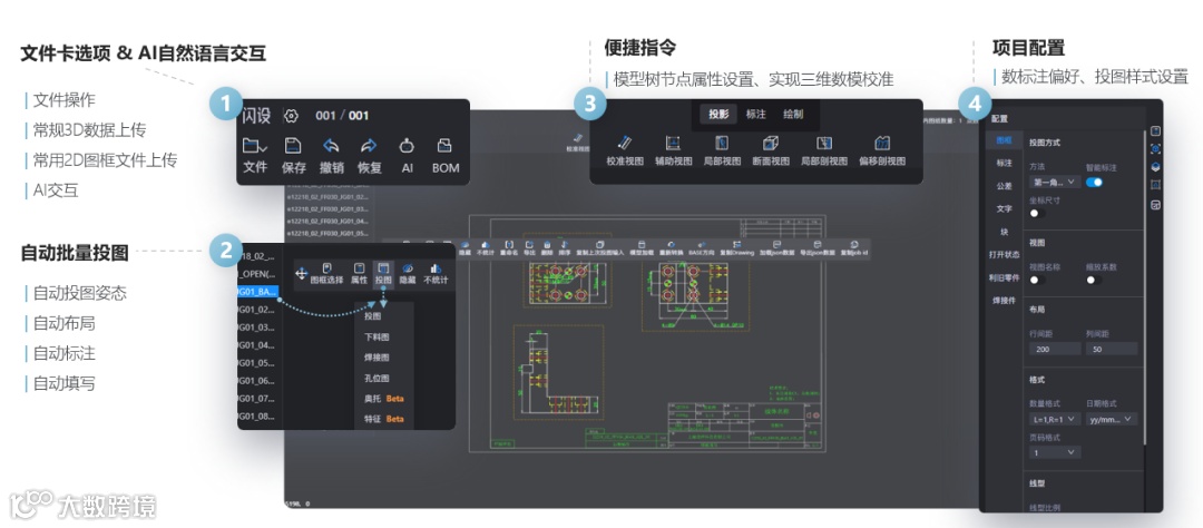 AI智能2D出图能够调用知识库中的虚拟专家,基于专家意见和交互批量生成二维图纸,从而在出图过程中有效利用企业既往出图规范,保证图纸准确。