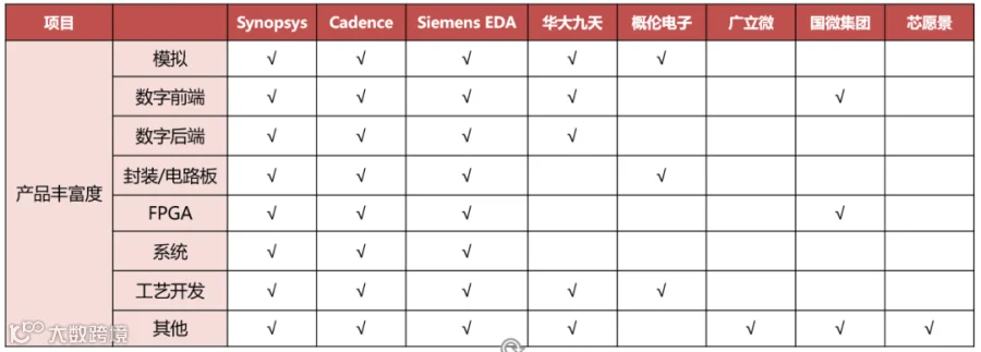 海外企业经年累月的大量研发投入使得其在产品线丰富度、渠道多样性上领先于国内 EDA 企业。目前我国 EDA 企业在局部环节具有优势,如华大九天的模拟电路仿真、概伦电子的 SPICE 建模领域等,但在产品丰富度上仍逊色于海外巨头。
