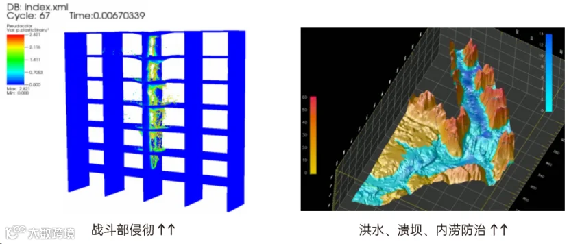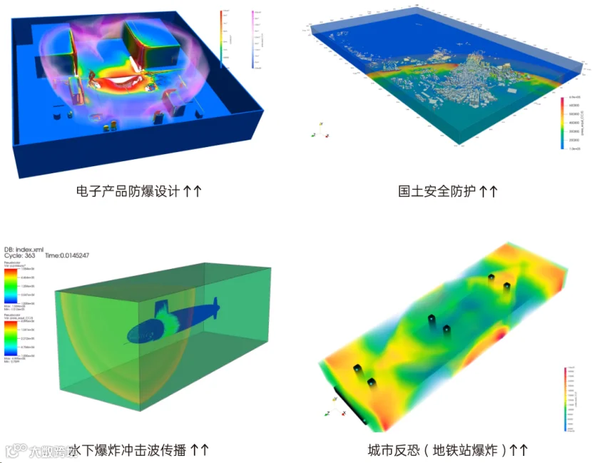 模拟爆轰波动态演化、电子产品的防爆设计、城市建筑的反恐设计、国土安全的防护模拟、水下结构的抗爆分析、结构的高速冲击损伤模拟、大范围流动灾害快速评估等问题。