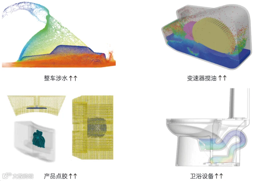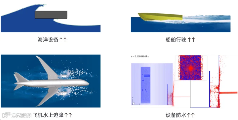 如汽车行业的整车涉水研究、新能源汽车和机器人行业的变速器搅油研究、电子行业的产品防水和点胶研究、风浪和洋流对海上设备的影响研究、飞机在水上迫降行为分析、船舶行业的行驶状态研究等。