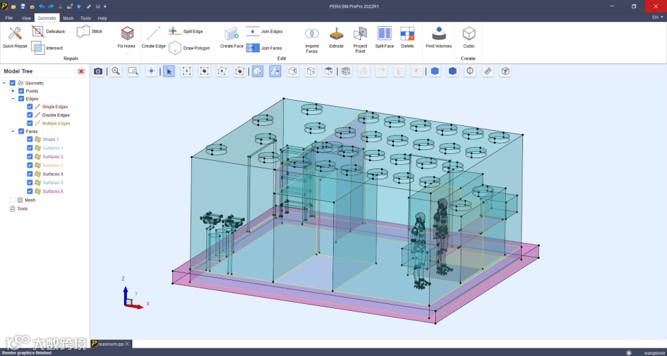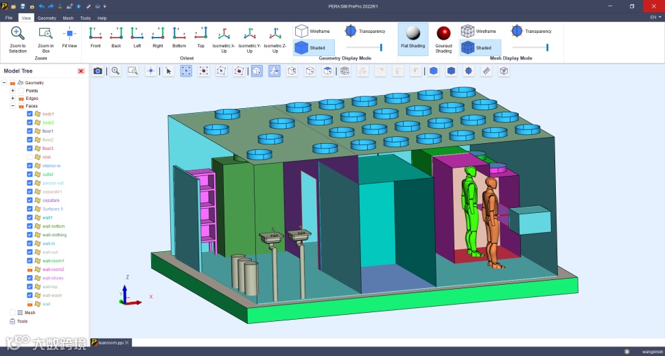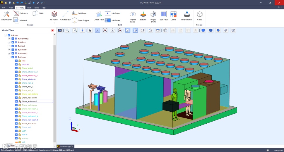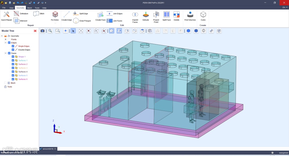 本文以洁净室内流场网格划分为例,介绍采用PERA SIM PreCFD进行模型简化并划分网格的流程。