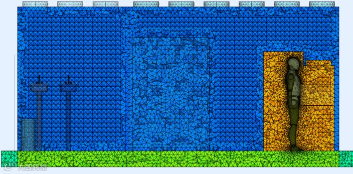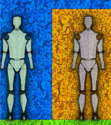 PreCFD可以对网格参数进行全局设置、局部设置,具有密度盒、边界层设置功能。本例中的全局尺寸函数设置面网格最大尺寸为80mm,增长率保持默认1.2,自动曲率加密角度18°,间隙加密2层;人体外表面添加局部尺寸加密,设置曲率加密角度为10°;面网格全部为三角形,如图7。