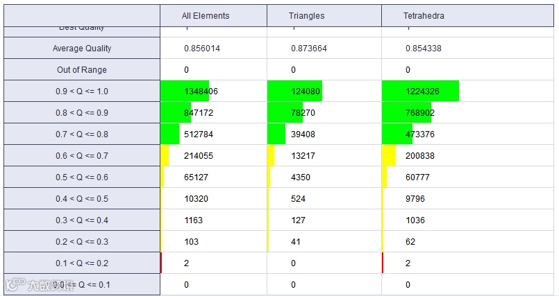 PreCFD具有专业的网格质量检测标准,包括网格数量、单元体积、单元质量、长宽比、正交性、扭曲度、几何和包面偏离度。图11展示了案例面网格和体网格的质量标准,可以看到最低的网格质量大于0.1,满足流体求解器的计算要求。