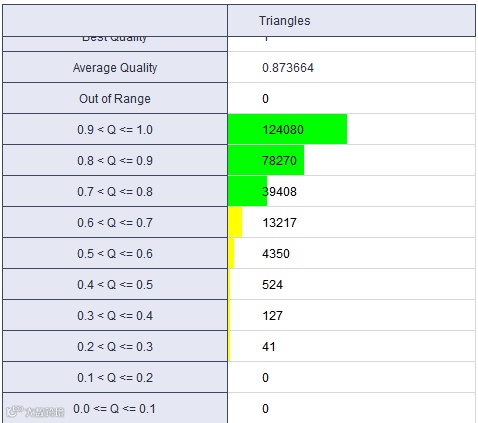 网格划分完成后,检查面网格质量,本案例中划分的面网格数量为26000,网格质量最小值大于0.2,网格生成时间为234s。