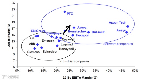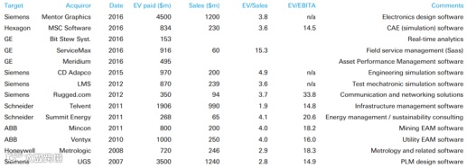 第三,在工业4.0时代,价值链上设计和制造的一体化,实体世界和数字世界的融合要求工业软件产品从面向特定产业具体环节的单一功能产品逐渐走向面向复杂场景价值链全生命周期的多功能平台,对于西门子和ABB等大型工业巨头,通过收并购构建平台是最有效率的手段。