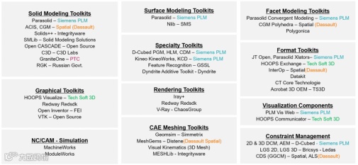 通过一些国内外业内人士的了解,一款主流MCAD软件,类似于SolidWorks、Solid Edge、Inventor类型的主流CAD的差不多需要用到70个组件(Components)。最核心的组件有几何内核(主要有西门子Parasolid,达索ACIS/CGM),2D/3D约束器(主要有西门子D-Cubed),图形组件(主要有TECH SOFT 3D),数据转换器(主要有达索与Tech Soft 3D),大部分CAD公司基于这几款组件就可以做起来。如果像CAE公司,还需要网格剖分器的组件(主要由Distene的MeshGems)。像Catia、NX、Creo这类产品可能会涉及更多的组件,其中有不少核心组件也是来自于第三方,甚至有些组件会来自竞争对手。,我们在商业化的工业软件的Copyright里面,可以发现不少信息,虽然未必别人愿意把所有第三方组件清单都公布出来,但是一些核心组件基本都有公布的。在这里还想再强调下,这段文字中所提的工业软件企业中,没有一家他们所提供的工业软件品中所有的代码都是自己的,就像汽车一样,这个产业也有着完整的供应链,是需要一群聪明的公司通力合作,很多产品全球化生产,领先企业聚焦自己的优势领域。