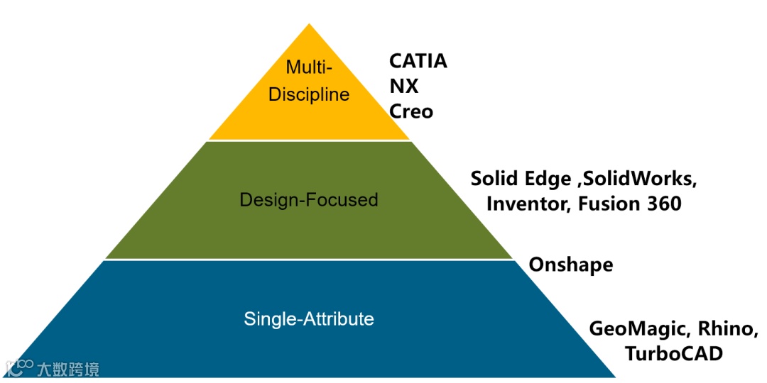 3、MCAD-DF与MCAD-MD,这里主要指工业设计软件,也是我们做工业软件研究的重点。其中3DCAD可以分为三大分类(如下图),即单领域的CAD(Single-Attribute),关注设计领域的CAD(Design-Focused),与多学科的CAD(Multi-Discipline),单领域的产品我们也比较好理解,比如做逆向工程的Geomagic Design X,做工业设计的Alias,Rhino等等。那么MCAD-DF与MCAD-MD共同特点是:都是端到端的解决方案。例如,机械设计领域有不同的建模方法,不仅能够覆盖从设计到出图的流程,也覆盖着不同的技术领域,除了机械设计以外还有电气设计、管路设计、模具设计等等。区别是:多学科MCAD不仅仅在这些领域覆盖更深更专业的功能,还涉及不同工程设计领域的系统化流程(Engineering Design, A systematic Approach, Third Edition, Springer),比如DFX(DFMA,DFSS,DFC等等),MBX(MBD\MBE\MBQ),MBSE,NPDI等等。