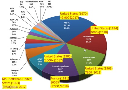 从上图我们还可以看到,工业软件行业中已经成长出来一批巨鳄型企业,排名靠前的几家企业,每一家企业基本上都经历了几十年的进化历史,同时拥有成千上万名工程技术人员。例如四大工业设计软件公司的员工人数都是在10000人以上的,仿真分析软件公司的员工人数也不少,在2000-3000人以上,当然其中包含了一部分市场营销人员,但是就笔者对一些公司的了解,即使刨去市场渠道人员,开发人员所占比重也不会少,而且这些企业之外也有庞大的生态圈,如果加上代理商的销售,售前售后技术人员,那就更多了。随着他们还在紧锣密鼓的布局与收购,相信这个规模与覆盖面还在技术扩大。而且其中的领先企业都会涉及到软件、硬件、工业服务等多个领域,都是一个多栖型的工业巨无霸公司。关于这些公司的收购详细信息可以通过本文中的提供的链接(Wikipedia,Fastway Engineering),以及Madsion Park Group(MPG)-《Engineering, Design, PLM & Simulation Software Market Update 2018 H2》报告,林雪萍、赵敏等研究人员的文章中也可以看到非常详细的信息。