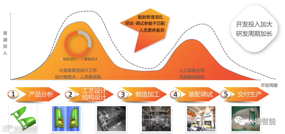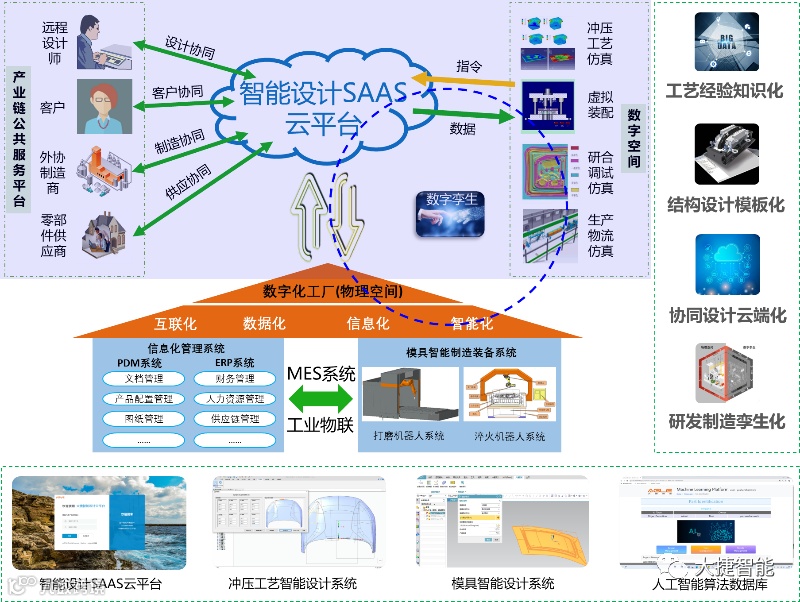 模具产业是汽车、电子与IT产品、家电、轨道交通、医疗等行业最主要的零部件制造手段和技术保障。我国作为模具最大市场,同时也是世界模具制造第一大国,2021年模具产值就已经超过3000亿,支撑着超过30余万亿元的制品成形制造,目前模具生产虽然已广泛采用CAD/CAM/CAE数字化设计制造技术,但是其“单件订制”生产特性,使得模具开发中严重依赖人工经验,生产的智能化成为行业技术进步的主要瓶颈。随着AI技术的兴起,以AI算法引擎结合模具工程大数据的深度耦合,为解决这一难题提供了可行路径。大捷智能结合模具行业龙头企业50多年的模具专业经验,开发了一系列人工智能算法,并付诸实践搭建了模具智能制造新模式。