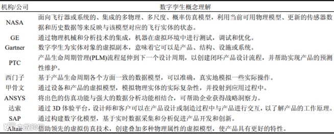 基于工业界及学术界对数字孪生的定义,《智能制造术语解读》将数字孪生技术定义为:是充分利用物理模型、传感器更新、运行历史等数据,集成多学科、多物理量、多尺度、多概率的仿真过程,在虚拟空间中完成映射,从而反映相对应的实体装备的全生命周期过程。数字孪生概念包含了几个关键要素:首先是物理实体:即真实存在的产品系统;其次是物理实体的虚拟数字模型: 通过数字化的手段所产生的产品系统的模型和镜像;最重要的是,物理实体和虚拟模型之间的数据和信息交互系统。包括从真实空间到虚拟空间的数据传输:研发阶段的样机和制造、运营阶段的产品向虚拟模型反馈数据从虚拟空间到真实空间的信息和流程:在研发和生产阶段。与此同时,也包括虚拟模型驱动样机和产品的生产;在运营阶段,虚拟模型可以反映和预测真实产品的运营状态,也可以驱动真实产品的更新(包括软件的更新)。