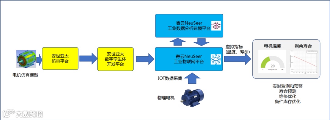国内杰出的仿真厂商安世亚太和工业互联网平台厂商寄云科技,也构建了类似Ansys与PTC Thingworx的合作联盟。通过将电机的仿真模型与真实采集的运行数据结合,构建多个基于仿真模型的虚拟传感器,实现更全面的状态监测、性能评估和预测性维护的能力。