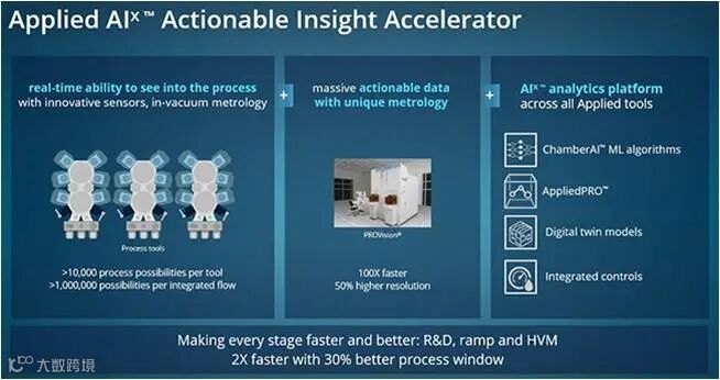 再比如全球半导体装备领导者美国应用材料公司,最近刚发布了新一代的智能平台AIx,可以结合设备采集的数百万点的实时数据和基于人工智能的分析,创建设备运行阶段的数字孪生,不仅可以实现对半导体生产过程的实时监测,还可以通过虚拟实验实现对每台设备数千个关键工艺参数虚拟调试和模拟,以满足半导体市场对指标如PPACt(Performance, Power, Area Cost, time-to-market)的持续优化。