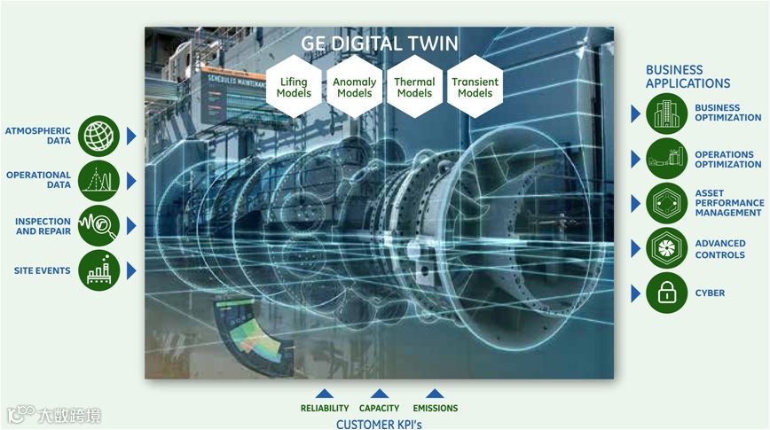 如GE采集大量燃气轮机产生的实时状态数据,并集成一系列包括气象、运营、维护、事件的数据,结合一系列异常监测分析、相似度对比、热力学模型的分析,可以对燃气轮机运行的关键指标进行实时计算、评估、诊断和预测,实现了设备可靠性、运营性能和效率以及安全的提升。