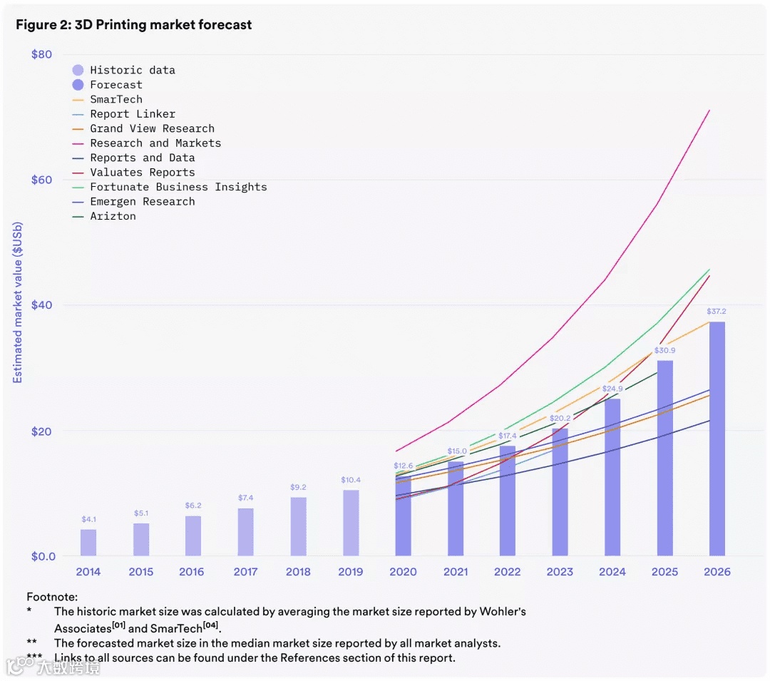 根据Smartech等9家机构估计,2020年全球3D打印市场达到126亿美元,比2019年同比增长21%。在未来三年中,分析师平均预期3D打印市场同比增长17%,到2026年将达到372亿美元。